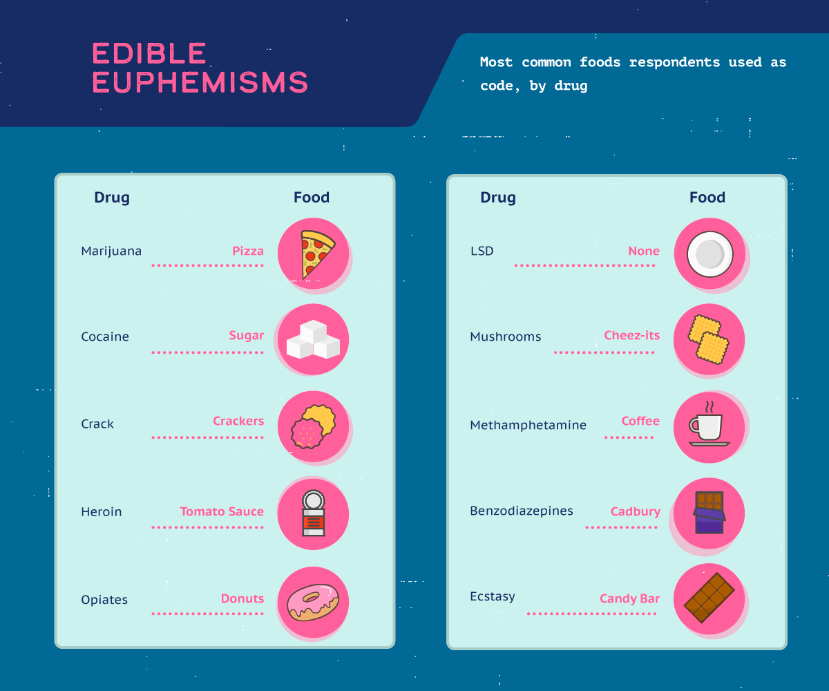 People we surveyed told us heroin was commonly referred to as tomato sauce, ecstasy was coded as Cadbury, and cocaine was abbreviated as sugar in casual conversation. Only the hallucinogenic LSD didn’t have a food equivalent nickname based on our research.