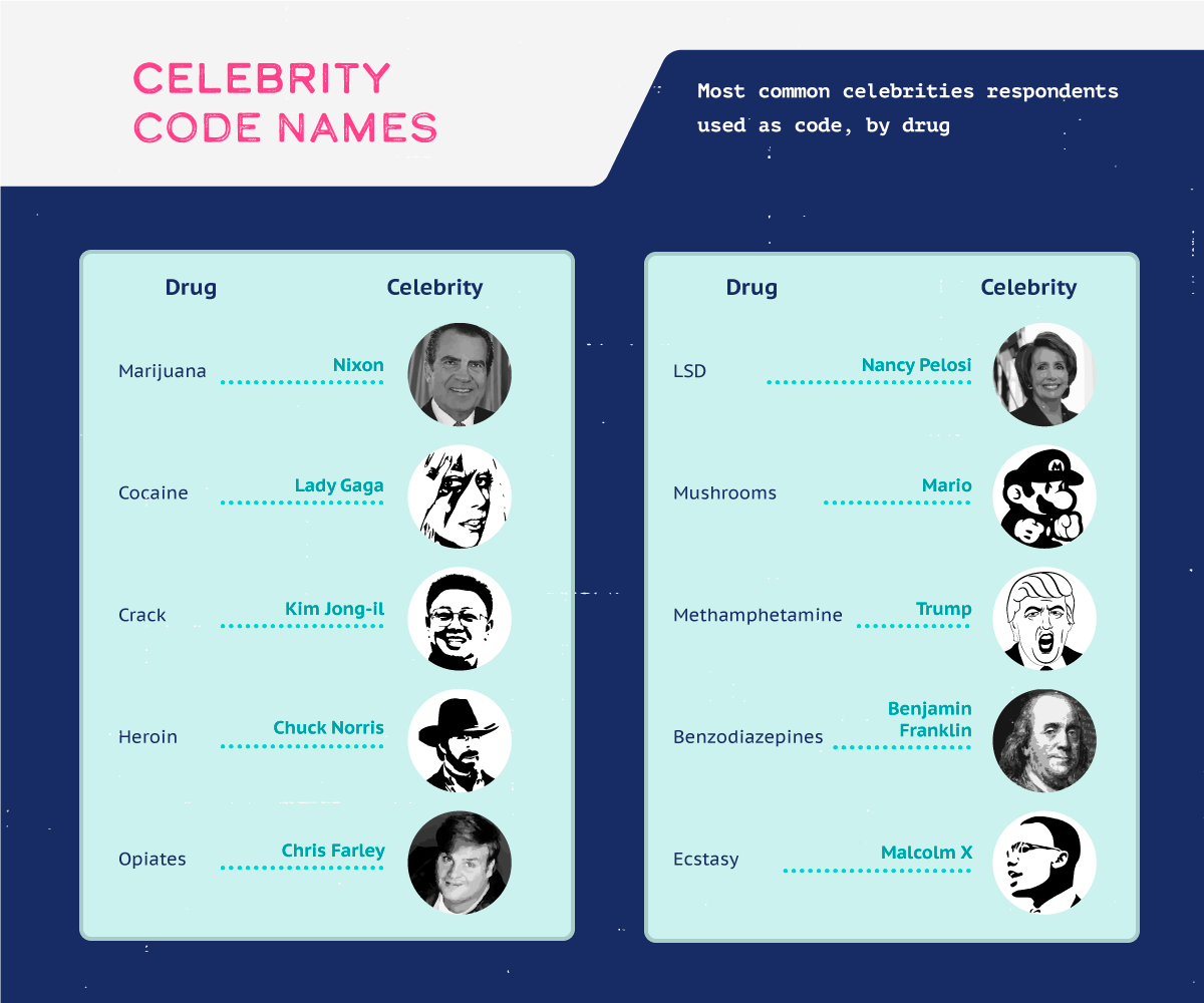 We conducted a survey of 2,000 Americans to find out what code words they use to discuss and purchase drugs. We analyzed responses based on age and the specific drug being purchased, and manually pulled all responses containing celebrity names or foods, as they were the highest categories based on the number of occurrences.